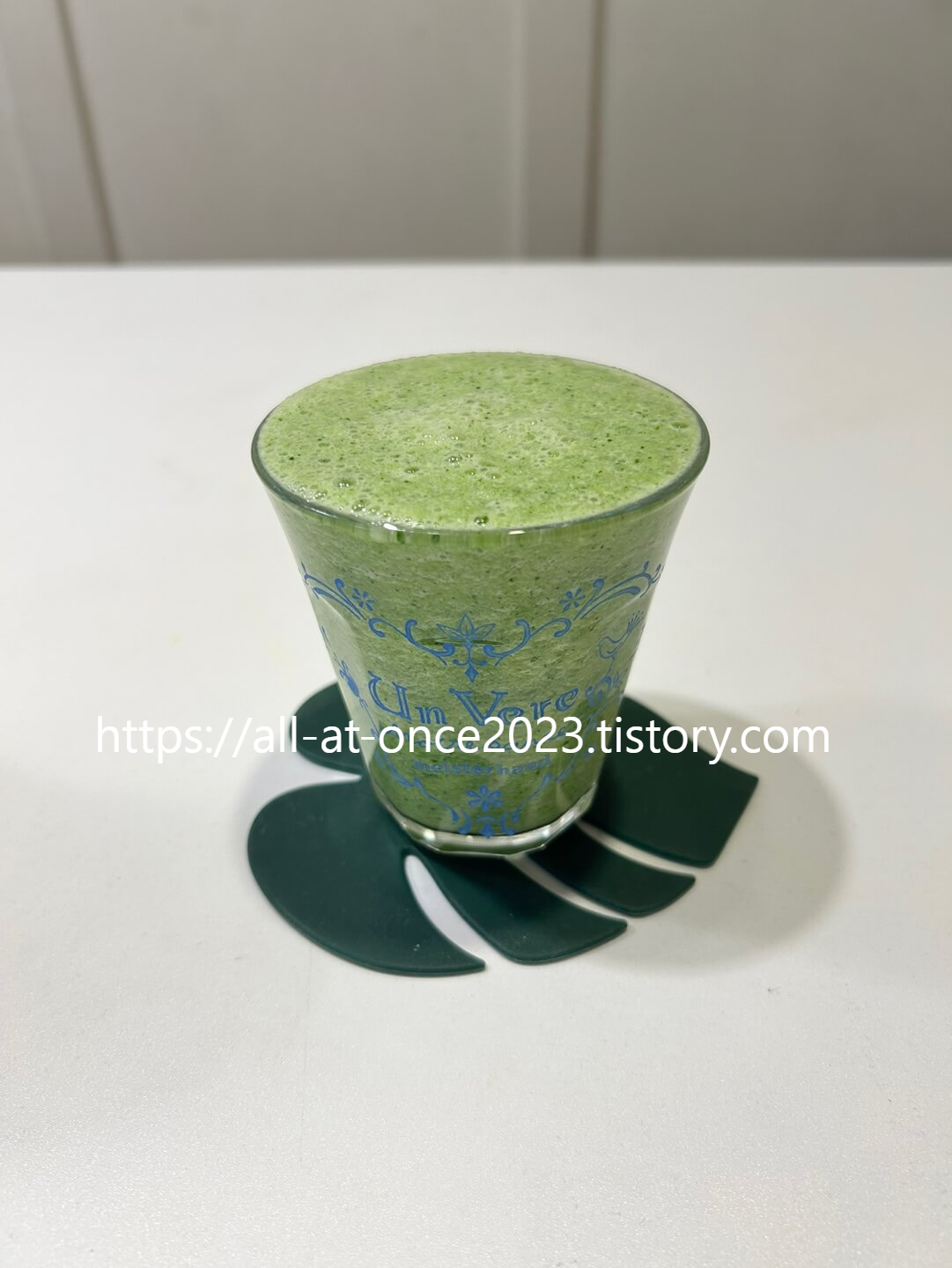 아피제닌 주스의 완성물은 초록초록 하면서 재료들의 건더기가 위에 떠 있는 상태였습니다. 특히 첫 모금에 브로콜리가 표면장력의 영향을 받아 위에 잔뜩 떠 있는 것을 알 수 있었습니다. 걸쭉한 느낌의 건더기가 입 안에서 걸렸지만, 재료 본연의 영양소를 섭취하기 위해서 따로 망이나 체에 거르지 않고 꼭꼭 씹어서 섭취했습니다.
